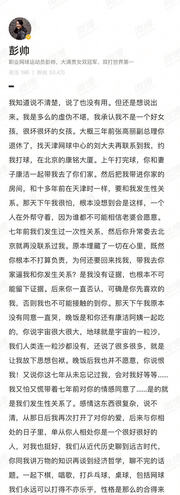 彭帥 微博全文 | 大瓜 彭帅在微博公布被前常委张高丽性侵以及情人关系 墙内疯传后全网删 新 品葱